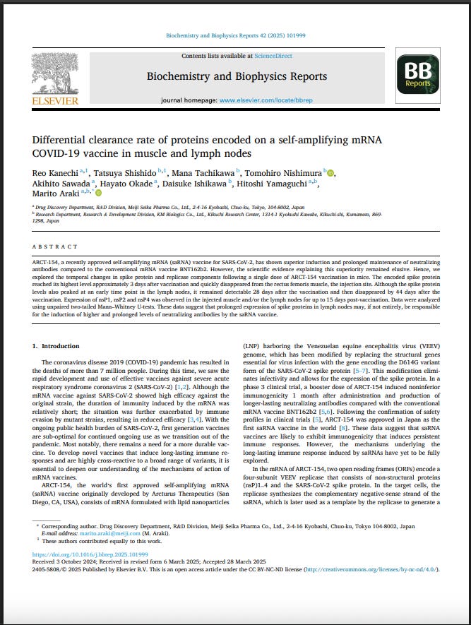 An April 2025 Biochemistry and Biophysics Reports publication confirms that the ARCT-154 spike protein was “detectable up to 28 days post-vaccination” in mice.