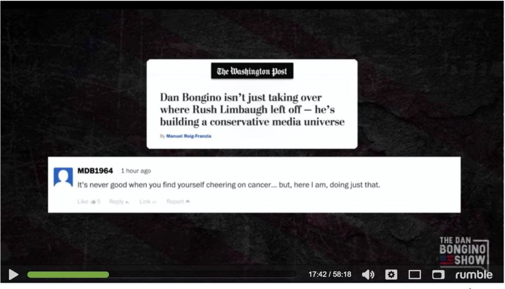 BECAUSE DAN BONGINO IS RIGHT ON TARGET WITH THESE NUTBAGS, THEY ARE ALL LEAVING HIM MESSAGES THAT THEY HOPE HE DIES FROM HIS CANCER DIAGNOSIS.