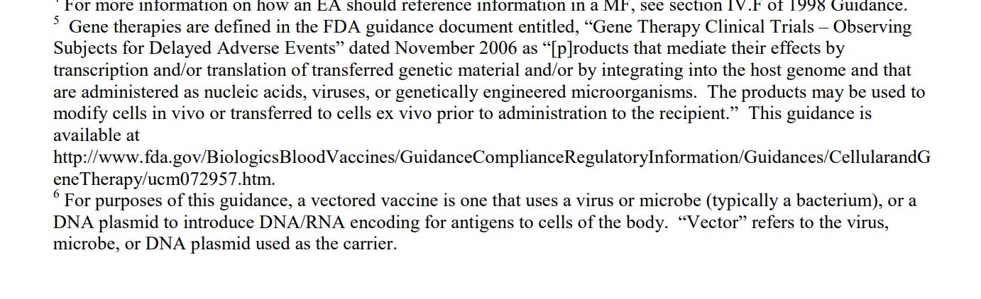 The March 2015 U.S. Department of Health and Human Services, the FDA and the Center for Biologics Evaluation and Research published a ‘guide for industry’ entitled: “Determining the Need for and Content of Environmental Assessments for Gene Therapies, Vectored Vaccines, and Related Recombinant Viral or Microbial Products” lists their definition of gene therapy.