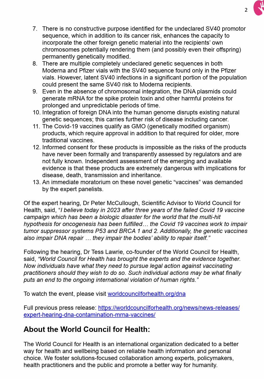 “The sequence that’s in these doses, at billions of copies per dose, interacts with the P53 gene. This is a tumor suppressor gene so anything that interacts as a contaminant in the gene is a red flag. Hit the brakes, stop cold. You’ve got billions of copies of something that interact with our tumor suppressor system. This is a cancer risk. It’s in Moderna’s patents. We know it’s now in the Pfizer vaccines. This needs to be a red stop halt.”