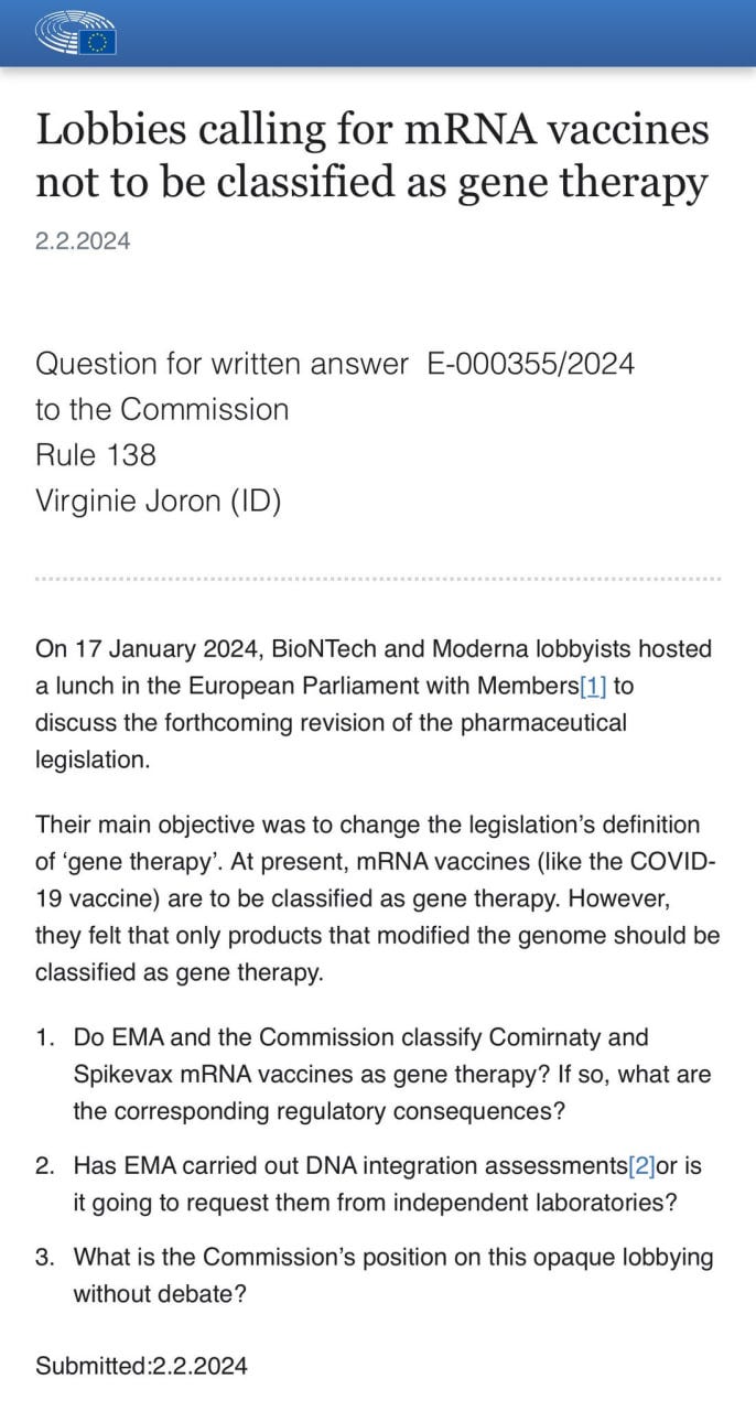 - Parliamentary question | Lobbies calling for mRNA vaccines not to be classified as gene therapy | E-000355/2024 | European Parliament (europa.eu)