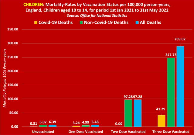 “In regard to Covid-19 deaths, the ONS reveals that the mortality rate among unvaccinated children aged 10 to 14 equates to 0.31. But in regard to one-dose vaccinated children, the mortality rate equates to 3.24 per 100,000 person-years, and in regard to triple vaccinated children, the mortality rate equates to a shocking 41.29 per 100,000 person-years.”Subscribe