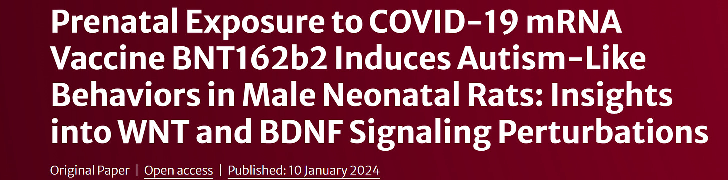 - Prenatal Exposure to COVID-19 mRNA Vaccine BNT162b2 Induces Autism-Like Behaviors in Male Neonatal Rats: Insights into WNT and BDNF Signaling Perturbations | Neurochemical Research (springer.com)