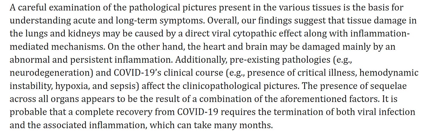 - ‘In the heart, SARS-CoV-2 positivity was found only in the endocardium and endothelium of a single case. Even though many have found the presence of ACE2 and TMPRSS2 to be consistent in the heart (especially in people with heart comorbidities), our results suggest that myocardial damage is not imputable to direct viral assault. The virus probably penetrates the heart, but the lack of cytopathic findings and the viral antigen negativity, observed by us as well as by others, indicates that the virus does not replicate within the heart, despite the presence of ACE-2 receptors that are, however, mainly expressed by endothelial cells.’