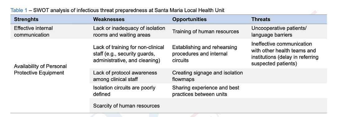 In the study’s structure, this language also appears under the “Threats” category of the SWOT analysis—placing patient behavior alongside infrastructure failures and staffing shortages as factors that could actively undermine outbreak response.