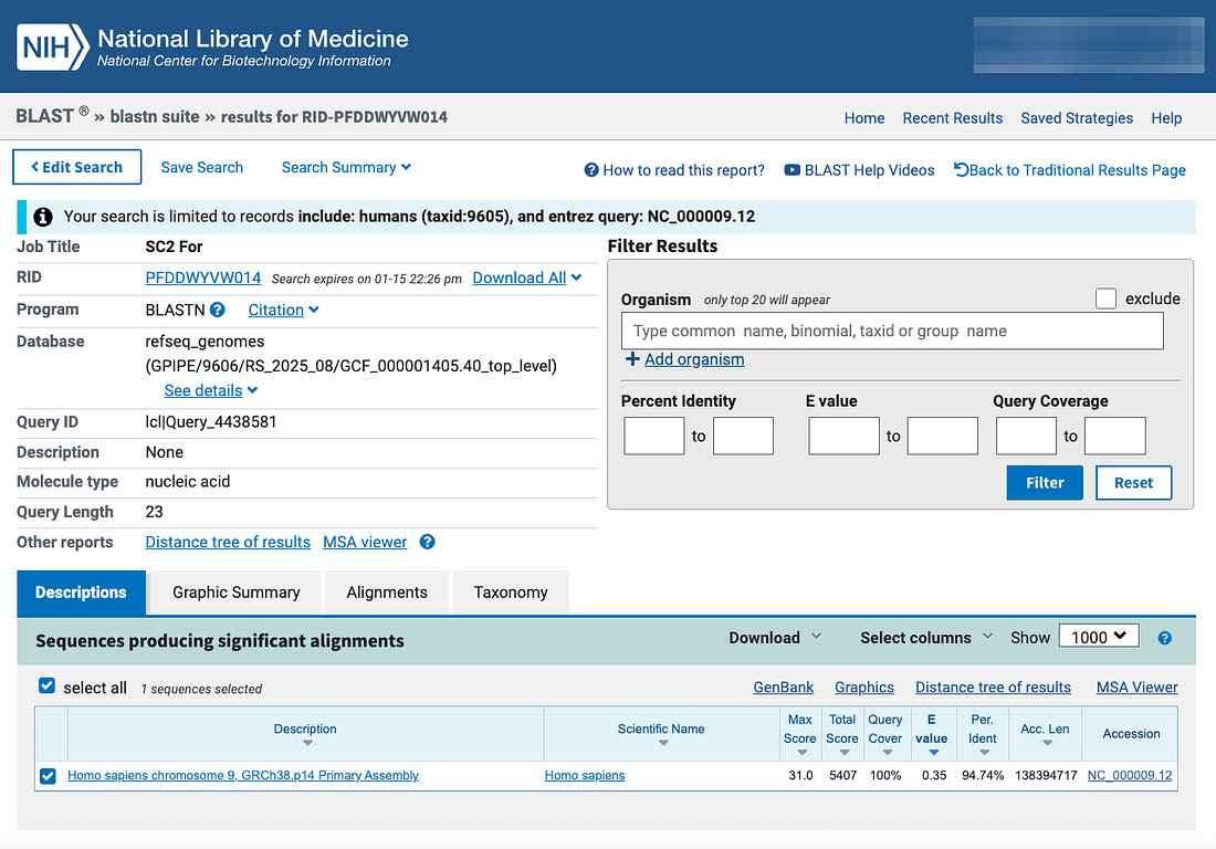 The results show that the primer has multiple perfect and near-perfect matches to the human genome, including: