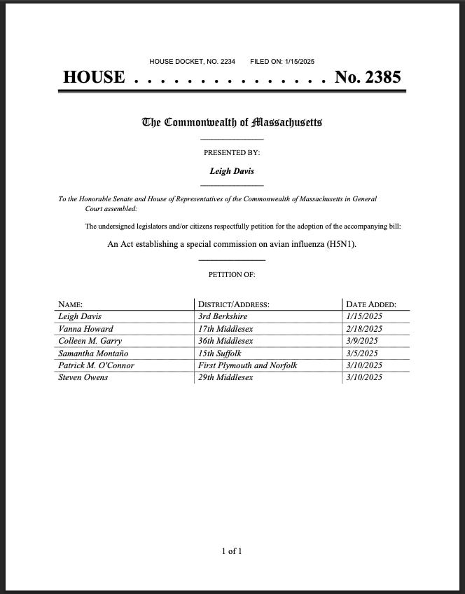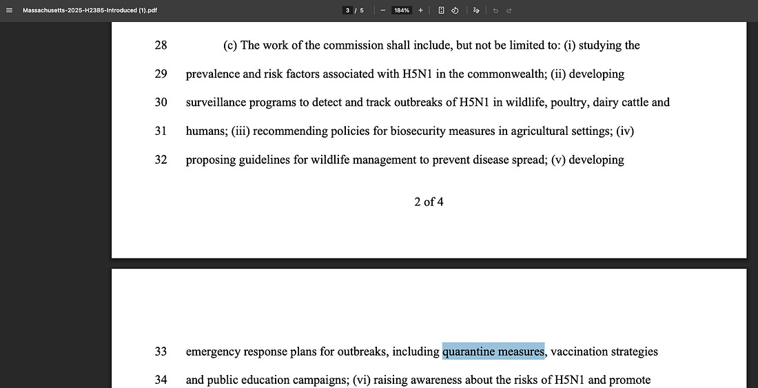 A Massachusetts bill laying out a full-scale response system for H5N1 avian influenza “bird flu” is advancing through the legislature—constructing quarantine protocols, mass surveillance systems, vaccine deployment planning, and statewide clinical trial infrastructure around a single named virus before any declared widespread outbreak.