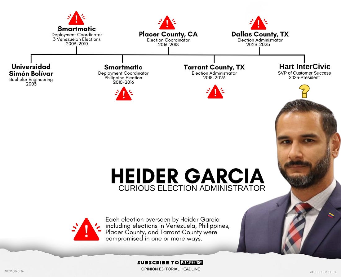Consider the case of Heider Garcia, a man whose career tells the story of how counties across the country have become dependent on a technocratic elite to manage elections they no longer understand. Garcia served in election leadership roles in three major US jurisdictions, Placer County, California; Tarrant County, Texas; and Dallas County, Texas. Each county adopted or maintained electronic voting systems, and each turned to Garcia when things went wrong. What made Garcia the chosen expert? His background was not in civic service or political reform. He was a senior employee of Smartmatic, one of the largest and controversial voting machine manufacturers in the world.